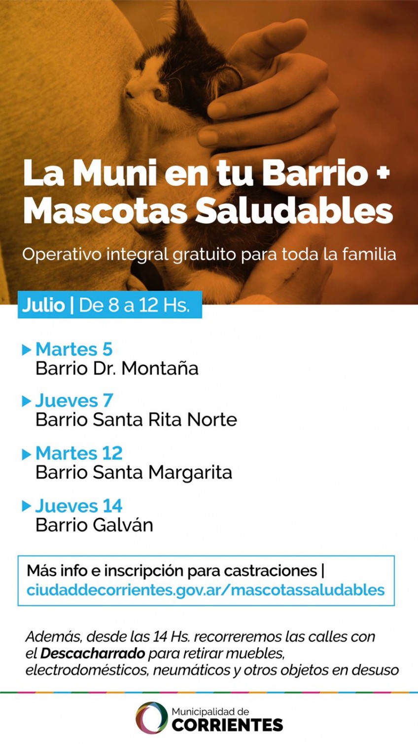 La Municipalidad de Corrientes acercó este martes múltiples servicios al barrio Doctor Montaña, a través del programa la Muni en tu Barrio. En el lugar, los vecinos pudieron acceder a prestaciones de salud, previsionales y atenciones veterinarias, mediante el programa Mascotas Saludables.