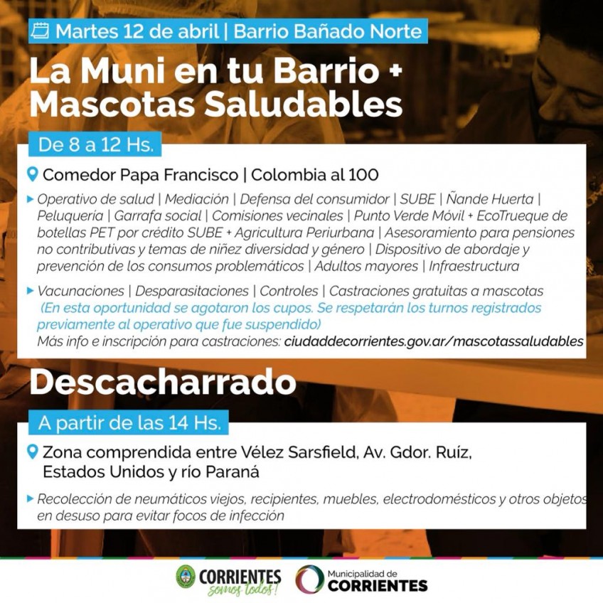 Los próximos operativos de la Muni en tu Barrio y Mascotas Saludables se llevarán adelante el martes 19 en el barrio Quilmes (Av. Juan de Garay y Hernandarias), el jueves 21 en el San Roque Oeste (Los Puelches y Río Limay), el martes 26 en el Quinta Ferré (Amado Bonpland y río Paraná) y el jueves 28 en el Pirayuí Nuevo (Rafael Barrios y calle 3).