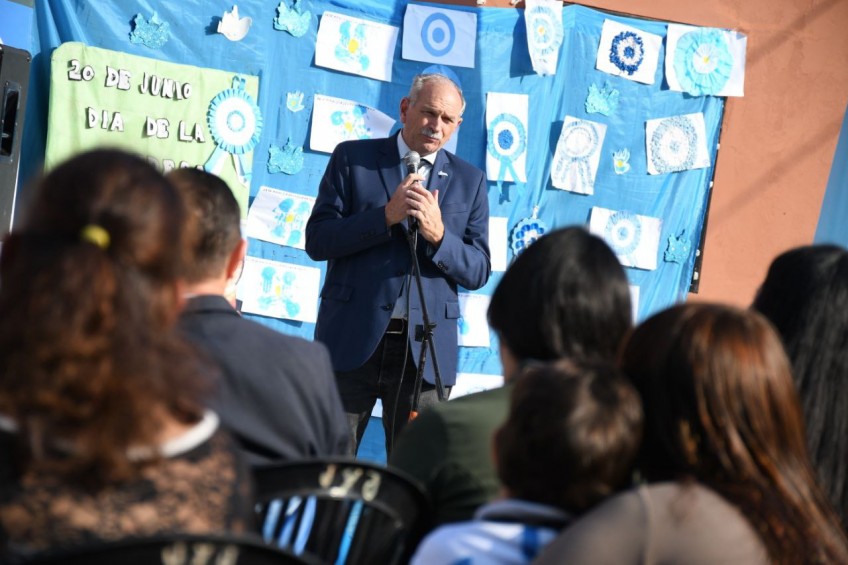 “Estamos celebrando la víspera del Día de la Bandera, y sobre todo la figura de Manuel Belgrano, un patriota de aquellos, que nació rico, terminó pobre, entregó todo por la patria, hizo mucho por la educación, y por el crecimiento económico”, afirmó el viceintendente Emilio Lanari, quien encabezó el acto, junto al subsecretario de Políticas Educativas, Néstor Frette.