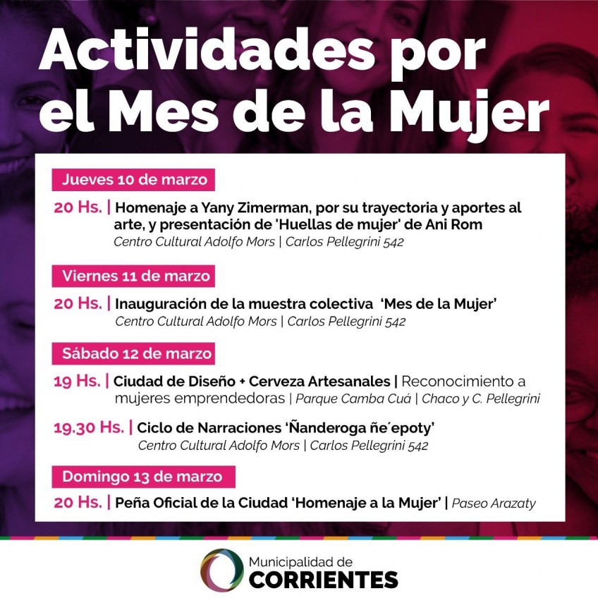 La Municipalidad de la Ciudad de Corrientes, por medio de sus diferentes áreas ejecutivas, tiene planificada una variada serie de acciones durante el mes de marzo. La agenda pretende dar un marco de reconocimiento y acompañamiento a la mujer correntina en todas sus expresiones.