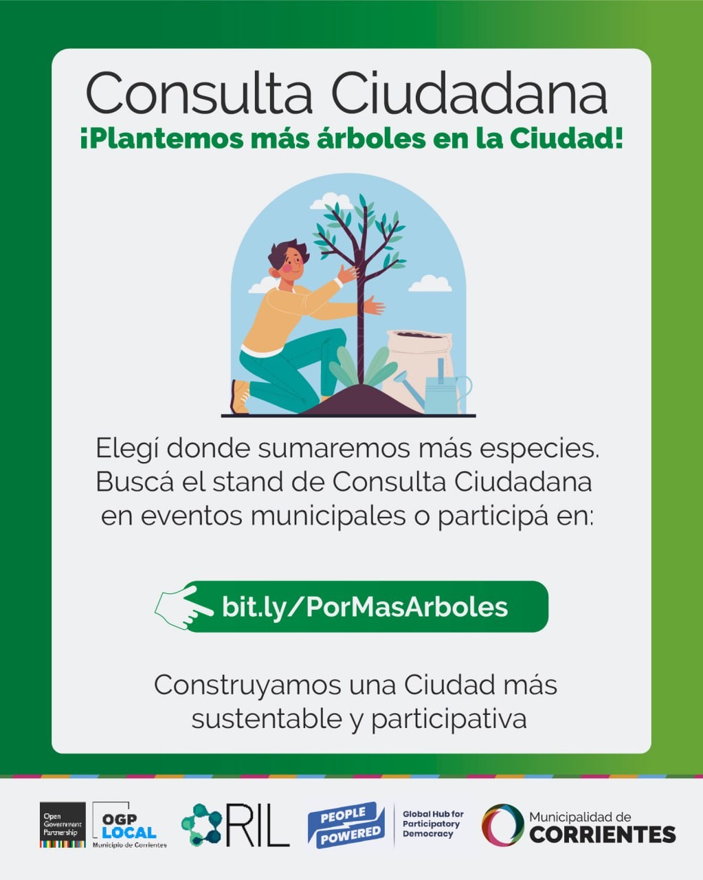 Con el objetivo de lograr una ciudad más verde y amigable con el ambiente, la Municipalidad de Corrientes está realizando una consulta ciudadana sobre el arbolado urbano. Para ello, es importante la colaboración de vecinos y vecinas, aportando sus ideas en esta iniciativa de buenas prácticas en el cuidado de los árboles. Las sugerencias pueden aportarse completando un simple y rápido formulario en el siguiente link: bit.ly/PorMasArboles