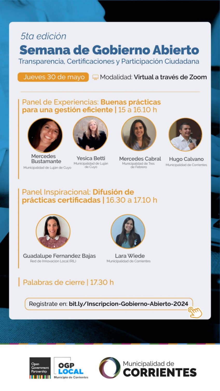 La Municipalidad de Corrientes participará este jueves 30 de mayo de la 5ª edición de "Gobierno Abierto: Transparencia, Certificaciones y Participación Ciudadana". El evento se realizará de manera online. Los interesados en participar deberán rellenar el formulario disponible en el siguiente link: https://bit.ly/Inscripcion-Gobierno-Abierto-2024