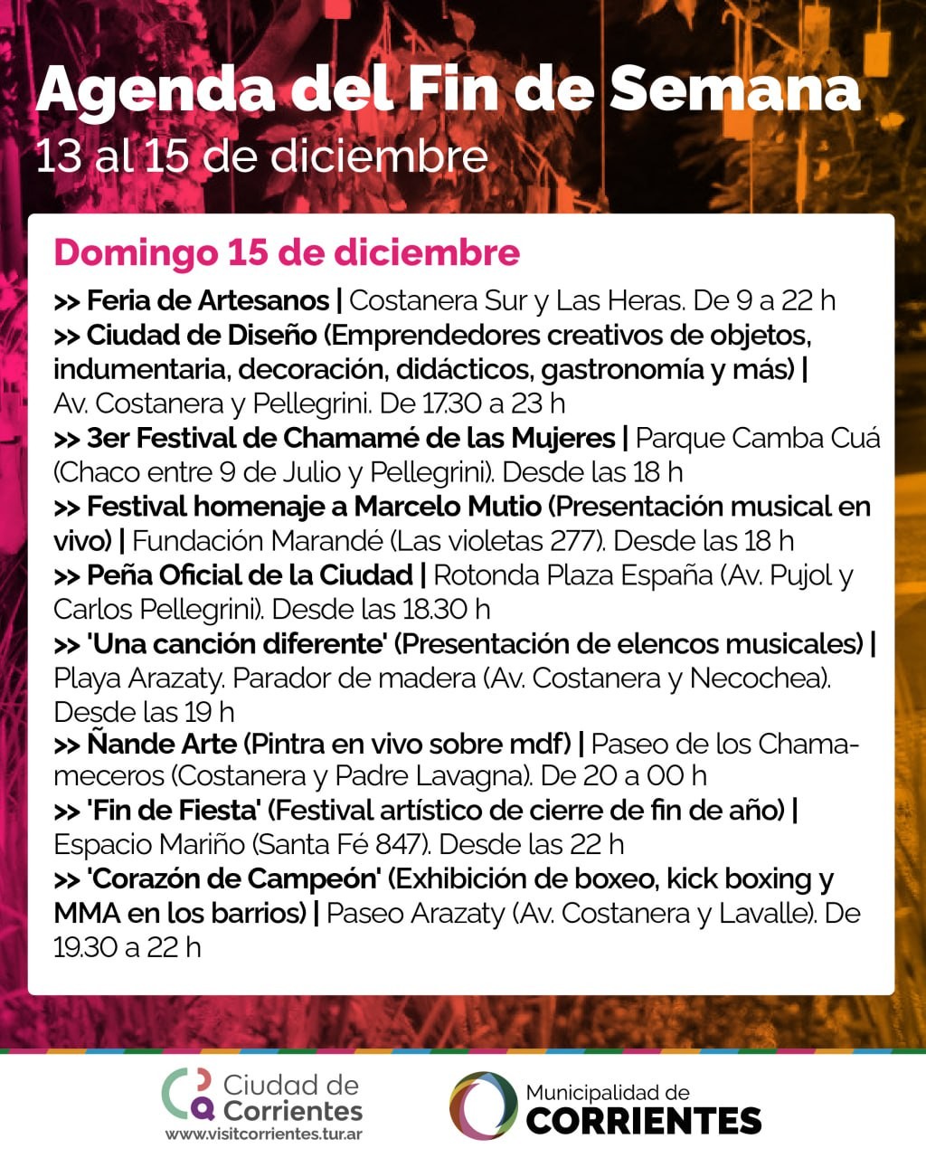 Como cada fin de semana, la Municipalidad de Corrientes pone a disposición de vecinos y turistas una amplia agenda de actividades para toda la familia. Entre las propuestas habrá ferias de artesanos y de adornos navideños, jornadas de recreación, chamamé, recorridos pedestres, encuentros de comics, desfile de modas y mucho más.
