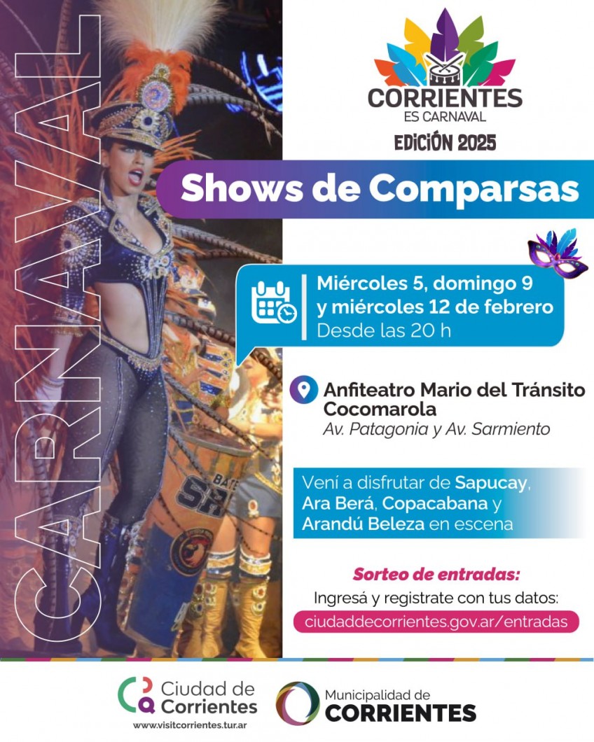 Al igual que años anteriores, la Municipalidad de Corrientes sorteará entradas para los shows de comparsas que se realizarán el 5, 9 y 12 de febrero próximo, a partir de las 20 horas, en el anfiteatro Mario del Tránsito Cocomarola, con la participación de las comparsas de primera categoría: Ará Berá, Sapucay, Copacabana y Arandú Beleza.