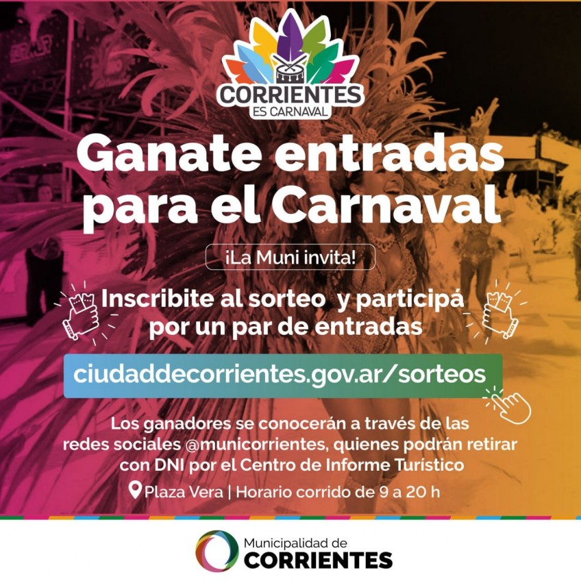 La Municipalidad de Corrientes sorteará 20 pares de entradas para cada una de las noches de los carnavales oficiales, que se realizarán los fines de semana del 27 y 28 de enero, 3, 4, 10, 11, 17, 18, 19 y 20 de febrero en el corsódromo Nolo Alías; y también para las noches de show de comparsas en el anfiteatro Cocomarola. Los interesados en participar deberán inscribirse a través de un formulario en: