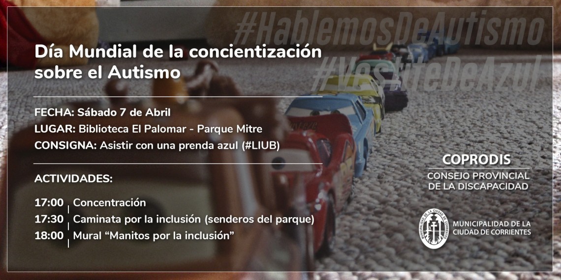 Con motivo de conmemorarse el pasado 2 de abril el "Día Mundial de la Concientización sobre el Autismo", la Municipalidad de la Ciudad de Corrientes (MCC) y el Gobierno provincial organizan una caminata por el parque Mitre prevista para este sábado desde las 17. Participarán del evento diversas instituciones que trabajan en la temática y niños que concurren a este tipo de entes.