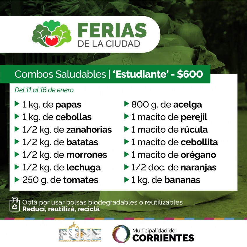 La Municipalidad de Corrientes acercará esta semana las Ferias de la Ciudad a diferentes plazas y paseos públicos para que los vecinos puedan acceder a productos de primera necesidad de calidad y a buen precio. Además, estarán disponibles los dos combos saludables: "Verde" (ocho productos) a $300 y "Estudiante" (14 productos) a $600.