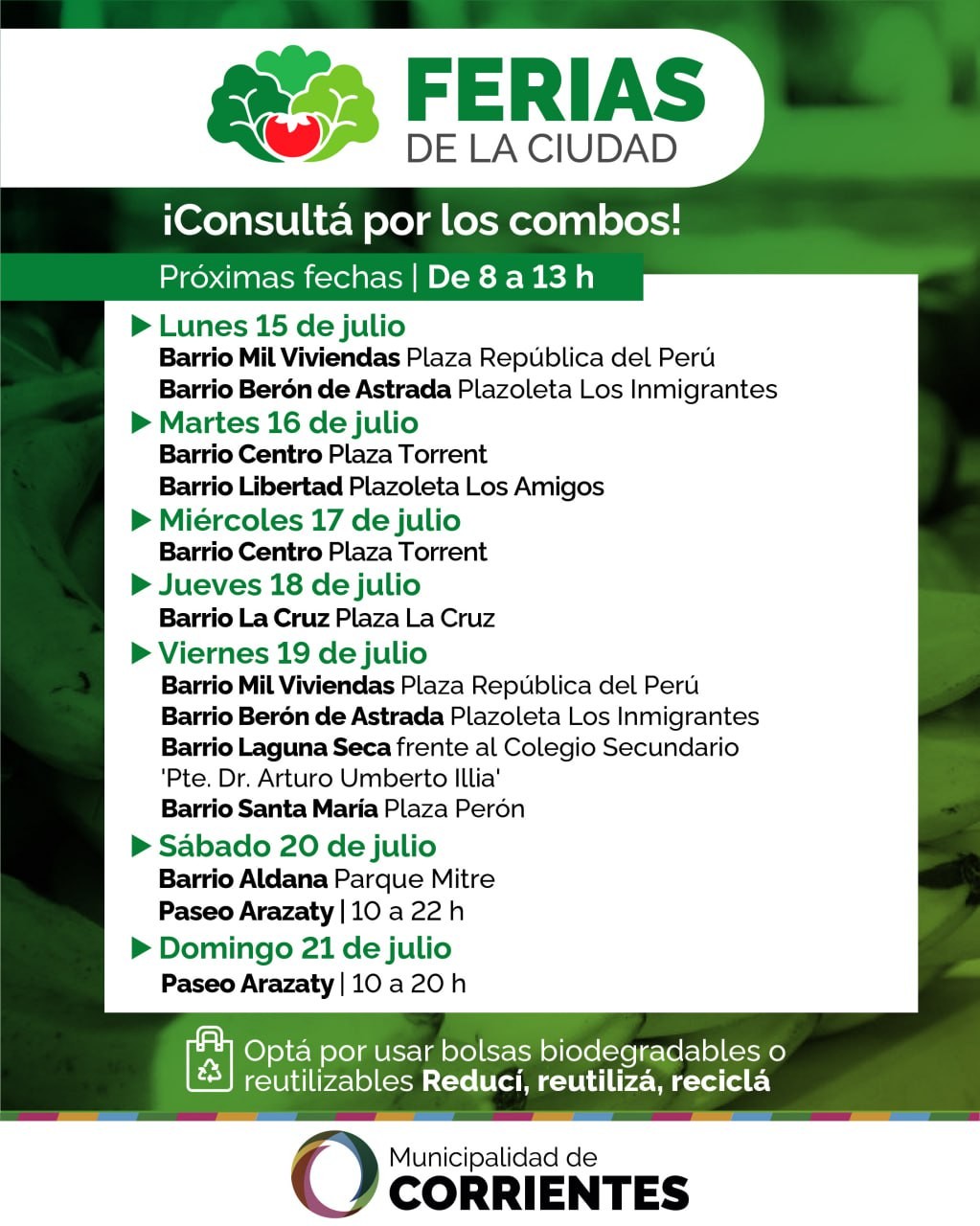 La Municipalidad de Corrientes dio a conocer la nueva programación de las Ferias de la Ciudad durante la semana que viene, desde el lunes 15 y hasta el domingo 21 de julio. La propuesta forma parte de una acción impulsada por la Secretaría de Desarrollo Económico municipal, a través de la Subsecretaría de Economía Social.