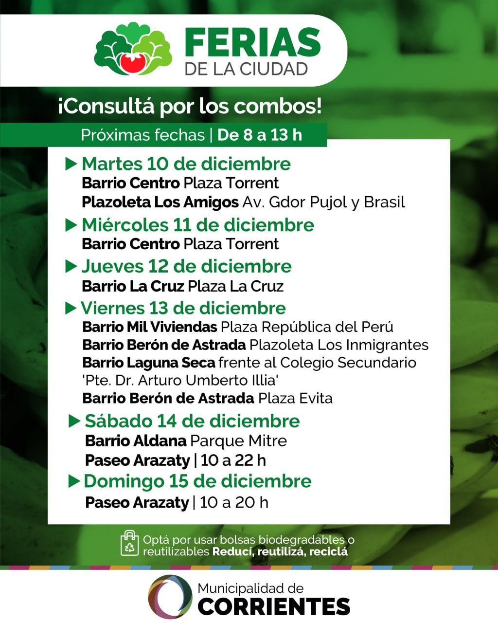 El jueves 12 de diciembre los feriantes se presentarán en la plaza La Cruz, mientras que el viernes 13 estarán simultáneamente en la plaza República del Perú del barrio Mil Viviendas; la plaza Los Inmigrantes del Berón de Astrada (Av. Sarmiento y Av. Correa Fernández); la plazoleta Evita y el campo de juego ubicado frente al colegio secundario Arturo Illia del barrio Laguna Seca.