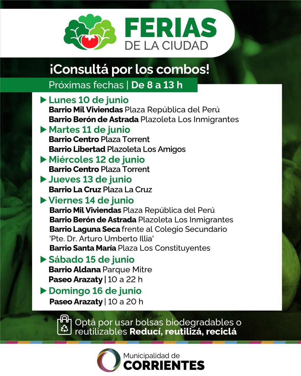 La Municipalidad de Corrientes dio a conocer la nueva programación de las Ferias de la Ciudad, que llegarán a distintos espacios públicos durante el transcurso de la semana de recorridos que inicia el lunes 10 y finaliza el domingo 16. Se trata de una acción coordinada por la Secretaría de Desarrollo Económico municipal, a través de la Subsecretaría de Economía Social.