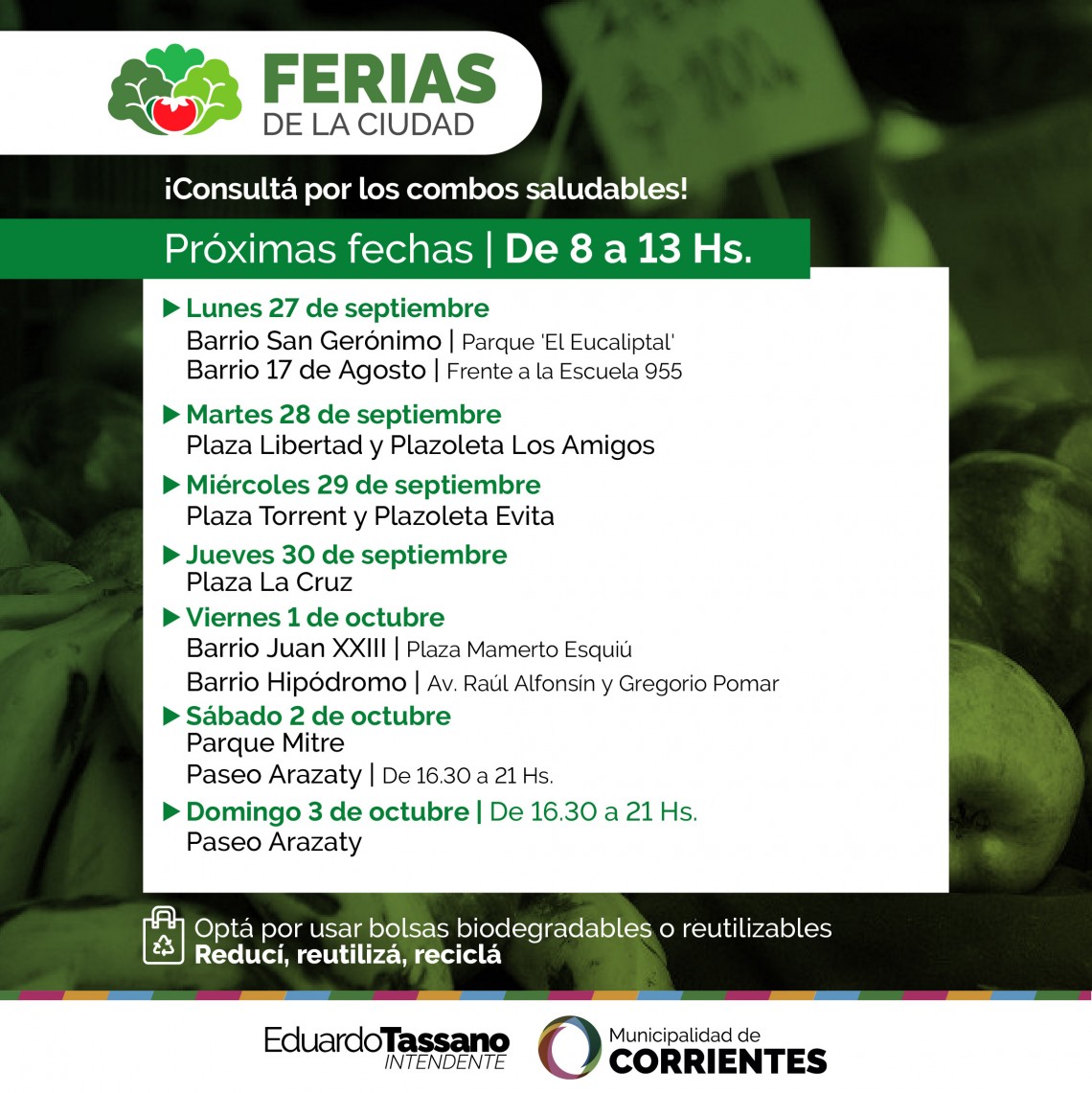 La Municipalidad de Corrientes acercará las Ferias de la Ciudad a diferentes barrios para que todos los vecinos puedan acceder a mercadería de primera necesidad y, además, estarán disponibles dos combos saludables. Durante la semana los productores estarán en plazas céntricas, paseo Arazaty y en espacios públicos de los barrios San Gerónimo, 17 de Agosto, Hipódromo y Juan XXIII.