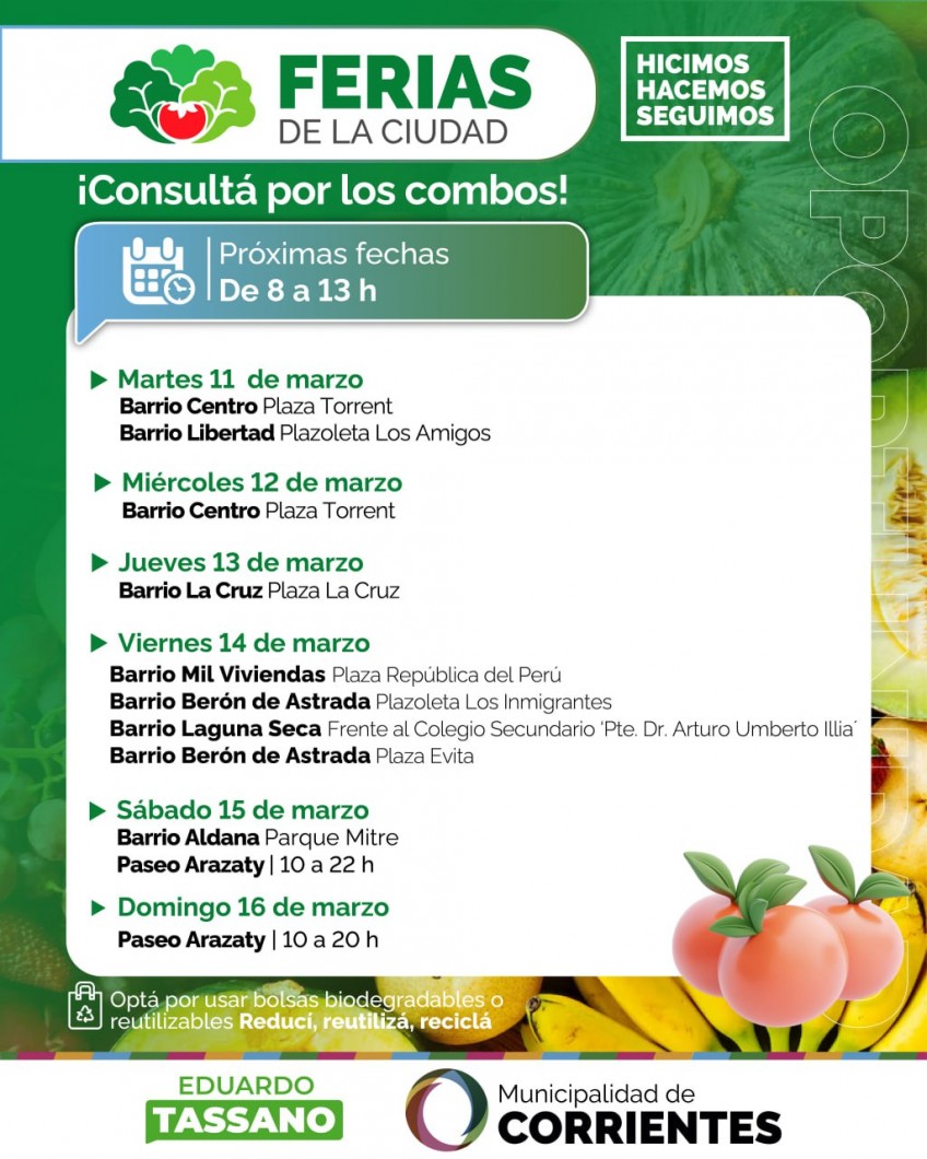 El jueves 13 de marzo los feriantes se presentarán en la plaza La Cruz, mientras que el viernes 14 estarán simultáneamente en la plaza Los Inmigrantes del Berón de Astrada (Av. Sarmiento y Av. Correa Fernández); la plazoleta Evita, el campo de juego ubicado frente al colegio secundario Arturo Illia del barrio Laguna Seca y en la plaza República del Perú del barrio Mil Viviendas.
