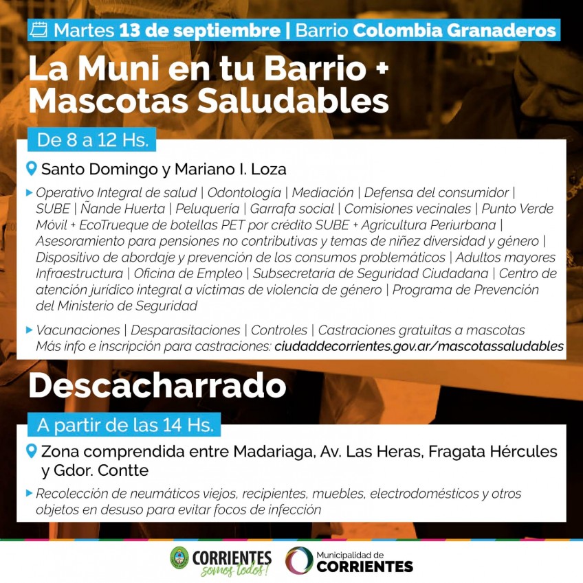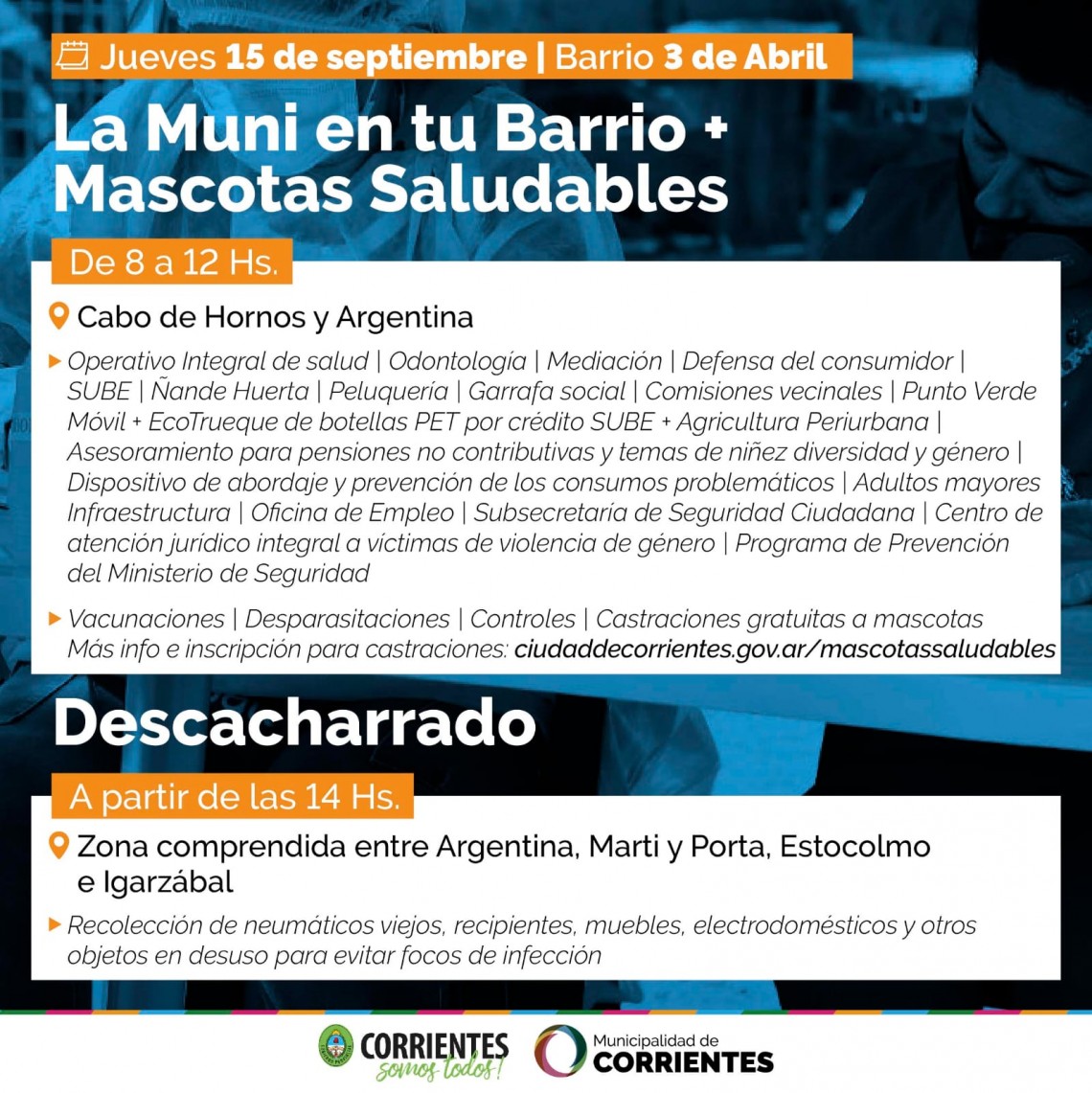 Como cada semana, la Municipalidad de Corrientes acercará múltiples prestaciones gratuitas para los vecinos de diferentes barrios, a través del programa “La Muni en tu barrio”. Además, estará presente el programa Mascotas Saludables y, por la tarde, el operativo de descacharrado para desechar todos los elementos que podrían actuar como focos para la reproducción del mosquito del dengue, el Aedes aegypti.