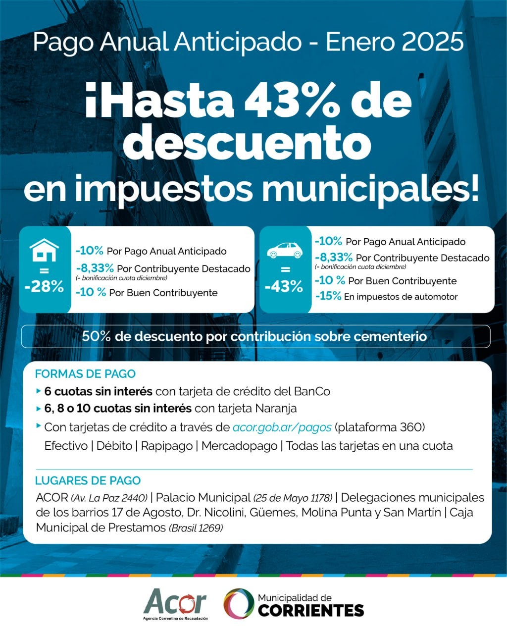La Municipalidad de Corrientes, a través de la Agencia Correntina de Recaudación (ACOR) informa que los vecinos tienen tiempo hasta el 31 de enero para adherirse a los importantes descuentos del Pago Anual Anticipado 2025. Para gozar de estos beneficios se deberá estar “al día” con el pago de los mismos en 2024.