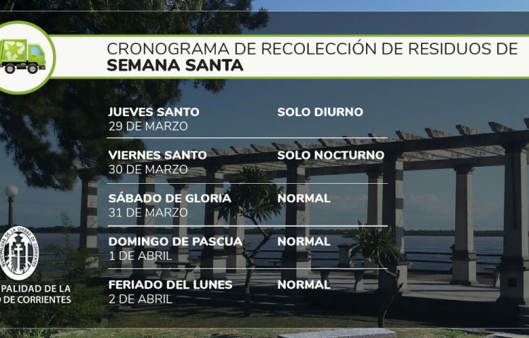 La Secretaría de Ambiente de la Municipalidad de Corrientes dio a conocer en detalle cómo se dará el servicio de recolección de residuos durante los días de Semana Santa, incluyendo el Feriado