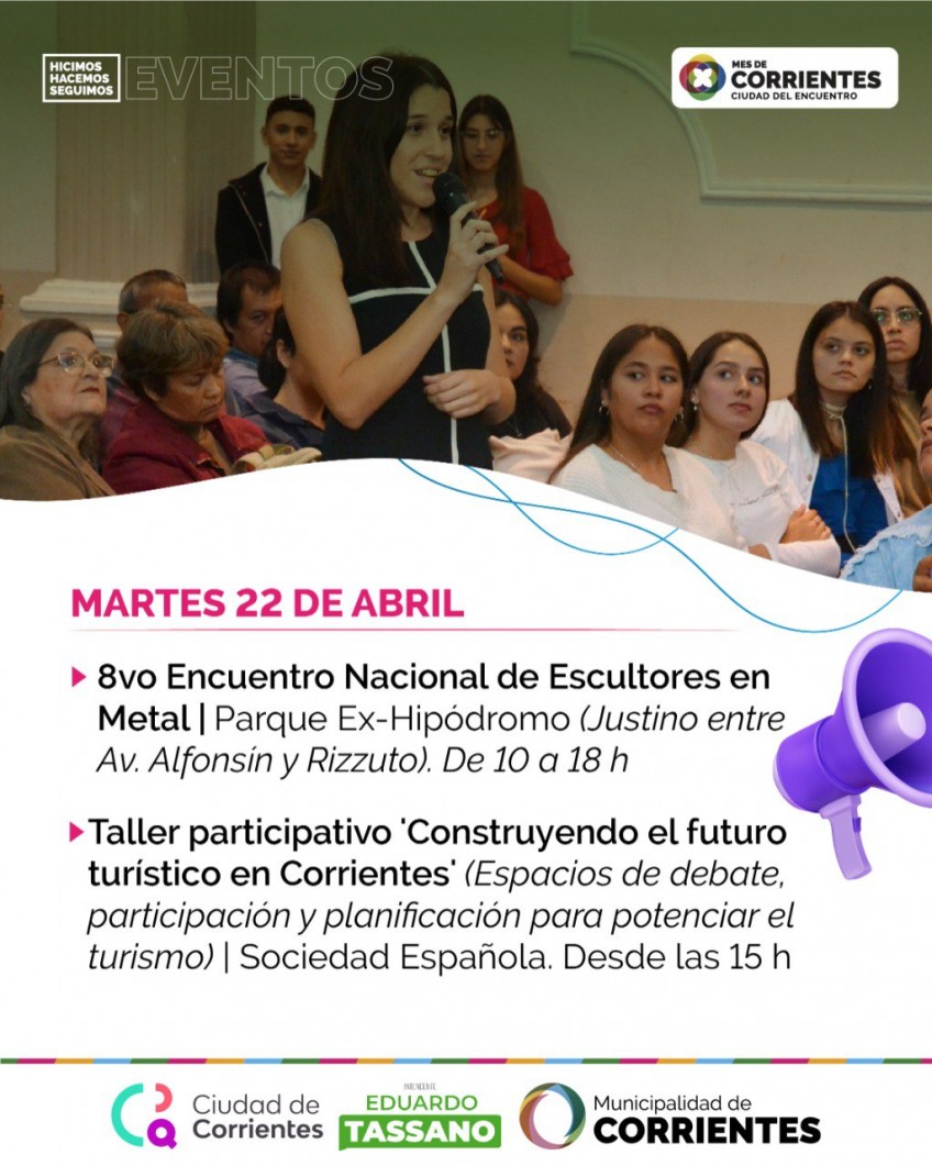 Desde el martes y hasta el domingo se realizará el 8° Encuentro Nacional de Escultores en Metal en el parque ex Hipódromo, ubicado por la avenida Alfonsín y calle Rizzuto, de 10 a 18, con acceso libre y gratuito. Además, este martes, pero en la Sociedad españa se llevará adelante el taller participativo 'Construyendo el futuro turístico en Corrientes'.