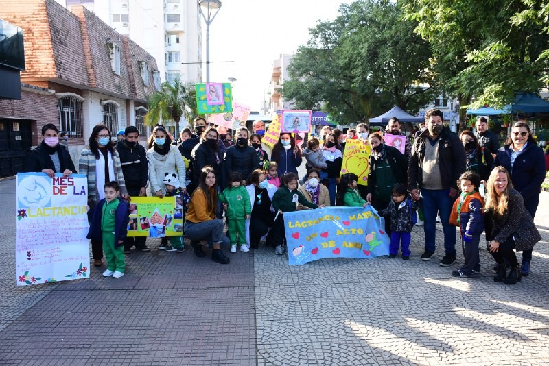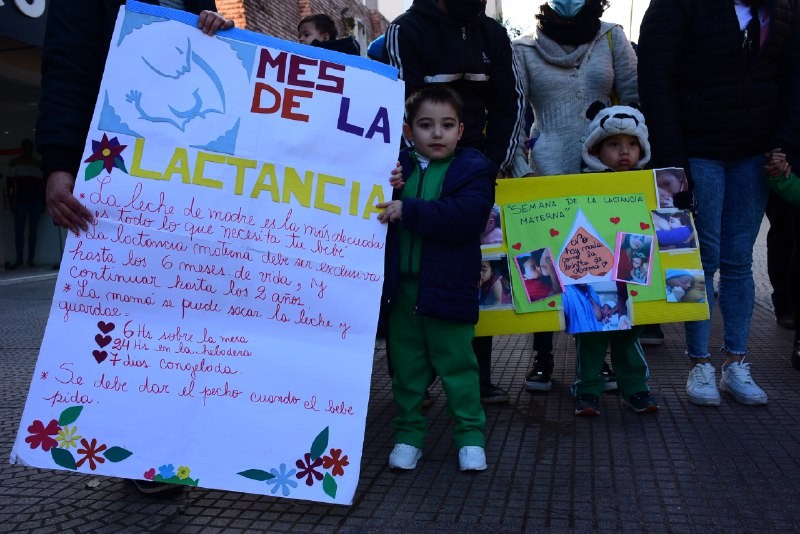 Cerrando las actividades que se organizaron por la Semana Mundial de la Lactancia Materna, niños y familiares de los CDI de los barrios San Benito, Doctor Montaña y Laguna Brava iniciaron una caminata por la peatonal Junín. Desde la plaza Cabral hacia la Vera, llevaban el mensaje de la importancia de dar de mamar, entregando souvenires y tarjetas confeccionadas por ellos mismos a los transeúntes.