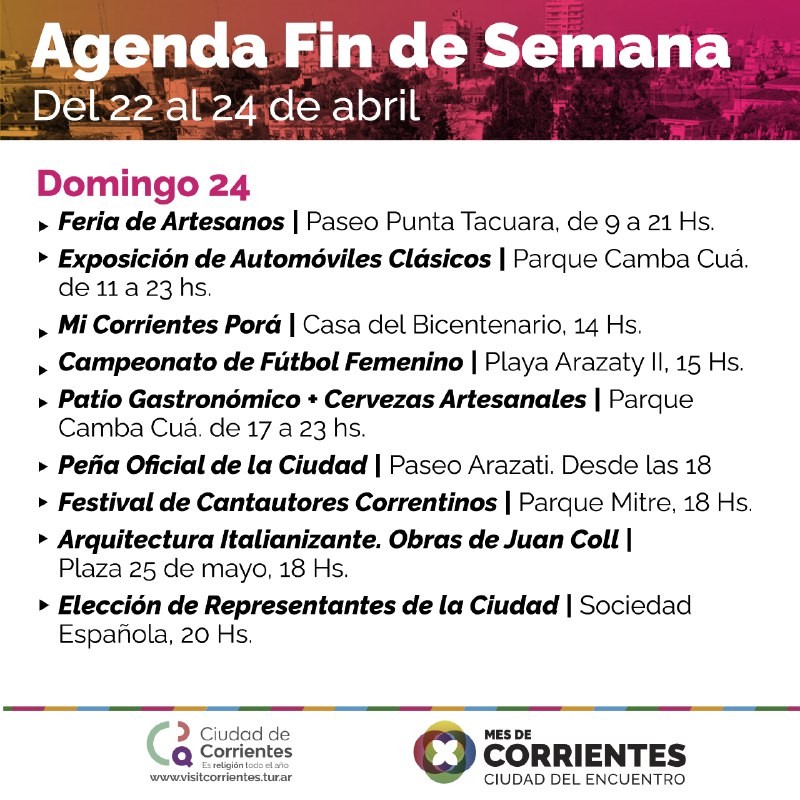 Una nutrida agenda de actividades culturales, deportivas y recreativas dispone la Municipalidad de Corrientes este fin de semana para que vecinos y turistas disfruten a pleno de los diferentes atractivos con los que cuenta la ciudad. Desfile, paseos turísticos, muestras, exposiciones, deportes y mucho más forman parte de las propuestas totalmente gratuitas.