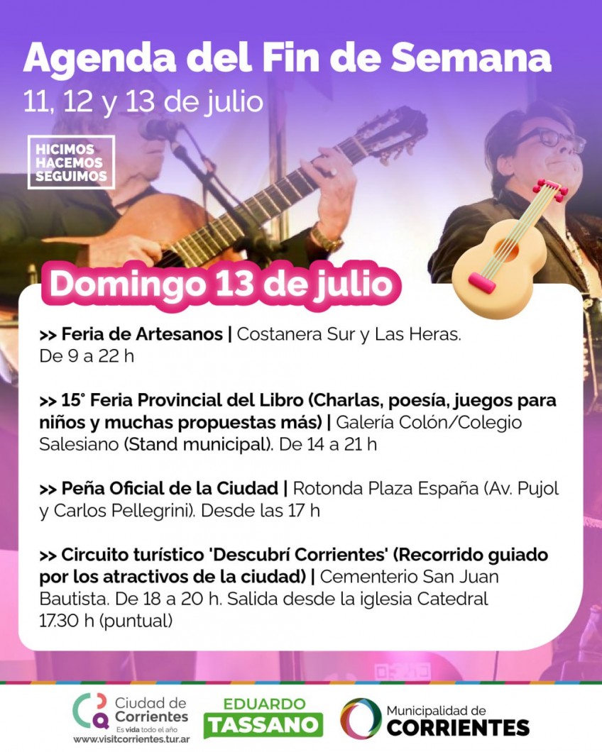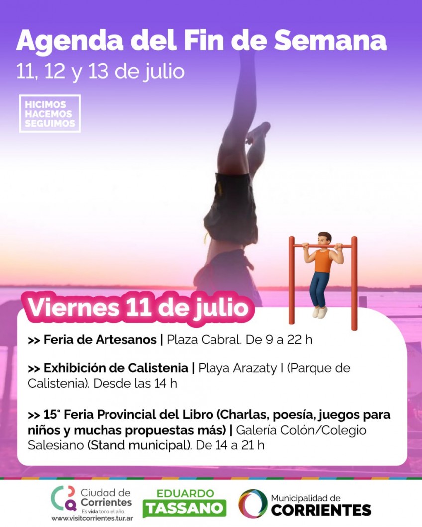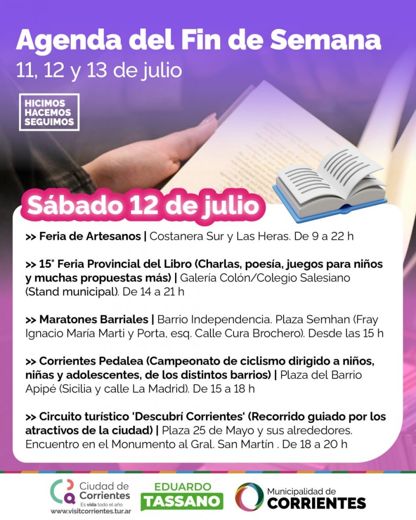 Este fin de semana, como antesala de las vacaciones de invierno, tanto vecinos como visitantes podrán disfrutar de distintas actividades propuestas por la Municipalidad de Corrientes. Habrá un stand exclusivo en la 15ª Feria Provincial del Libro, maratones barriales, calistenia, bicicleteada, recorridos pedestres guiados y las clásicas ferias y peñas.
