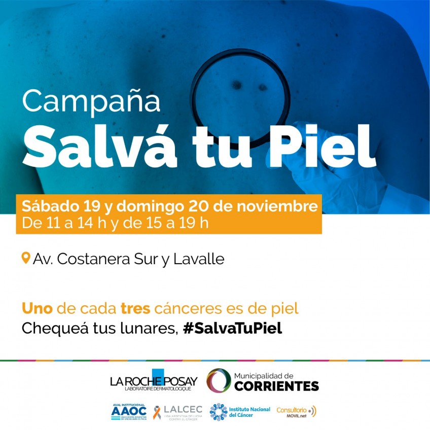 La campaña, denominada “Salvá tu piel”, tiene el objetivo de generar medidas de prevención sobre el cáncer de piel y estará acompañada por la secretaría de Salud del municipio. La atención será en la intersección de la avenida Costanera Juan Pablo II y la calle Lavalle.