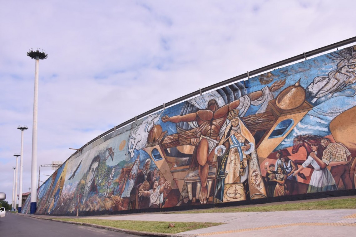 El intendente encabezó la reinauguración de la obra situada sobre la bajada del puente Manuel Belgrano, donde la Municipalidad recuperó y puso en valor esta enorme obra artística de más de 300 metros. En su momento, fue el mural más extenso de América Latina. Contiene distintos pasajes de la historia y la cultura de Corrientes.