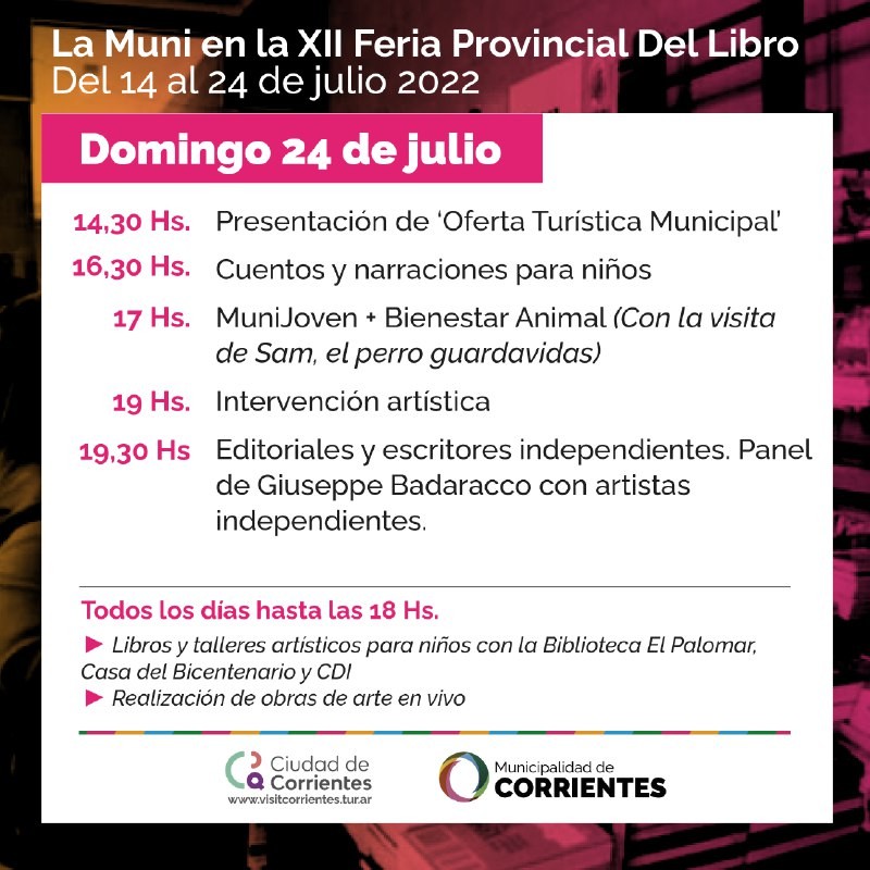 Con stand de promoción turística y diferentes actividades, la Municipalidad sigue diciendo presente en la XII Feria Provincial del Libro 2022 que se desarrolla hasta este domingo en la Ex Usina (avenida costanera General San Martín y Pasaje Edison).