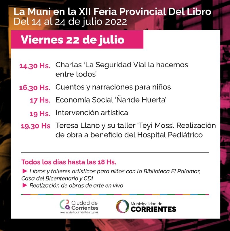 En este marco, este viernes 22 a las 14.30 en el stand municipal se realizará la charla “La Seguridad Vial la hacemos entre todos”. Luego a las 16.30 habrá cuentos y narraciones para niños y a las 17 se expondrá sobre el programa Ñande Huerta. A las 19 habrá una intervención artística para concluir la jornada, y a las 19.30 se realizará una obra a beneficio del hospital Pediátrico a cargo de Teresa Llano y su taller “Teyi Moss”.