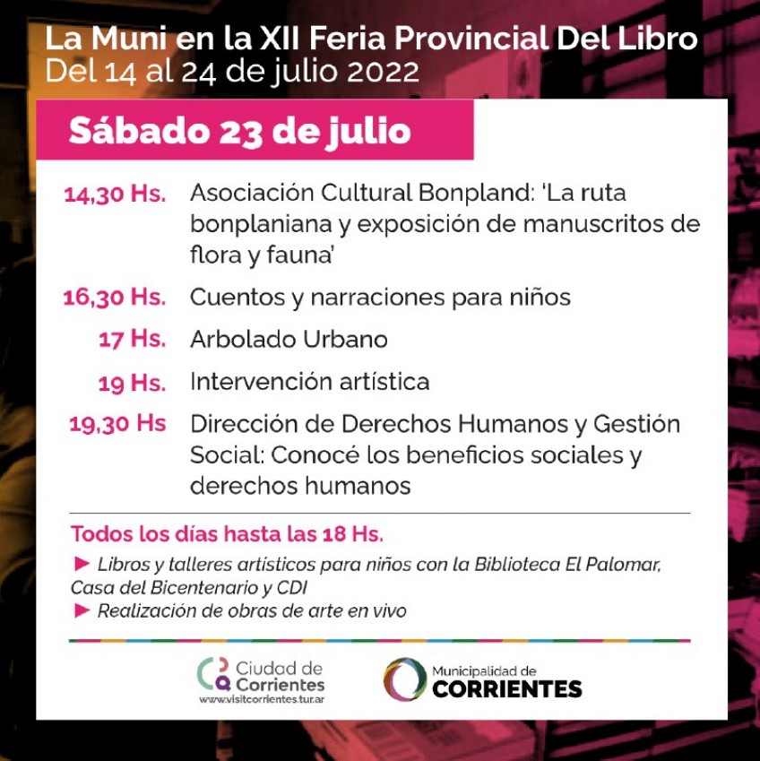 En lo que respecta a la agenda del sábado en el stand municipal, a las 14.30 se presentará “La ruta bonplaniana” y exposición de manuscritos de flora y fauna. También, durante la tarde, habrá cuentos y narraciones para niños, una exposición sobre arbolado urbano. Como cierre, se realizará una intervención artística y se dará una charla sobre beneficios sociales y Derechos Humanos a cargo de la Dirección de Derechos Humanos y Gestión Social.