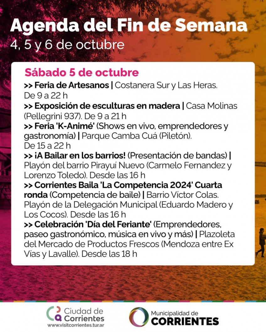 La Municipalidad de Corrientes preparó un gran festival para abrir formalmente la temporada en los cinco balnearios públicos que, de octubre a abril, ofrecerán servicios y seguridad a miles de correntinos y turistas. Este evento se suma a las múltiples alternativas que se desarrollarán durante el fin de semana en otros puntos de la capital, como peña, festival k-anime, k-pop, chamamé, carnaval y maratón.