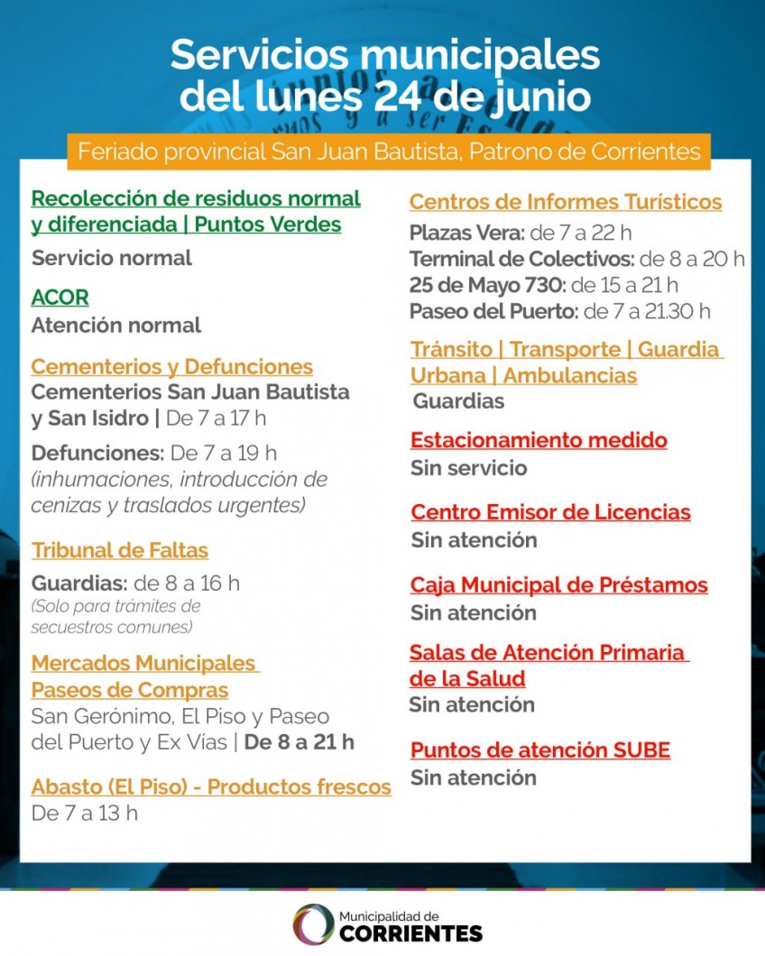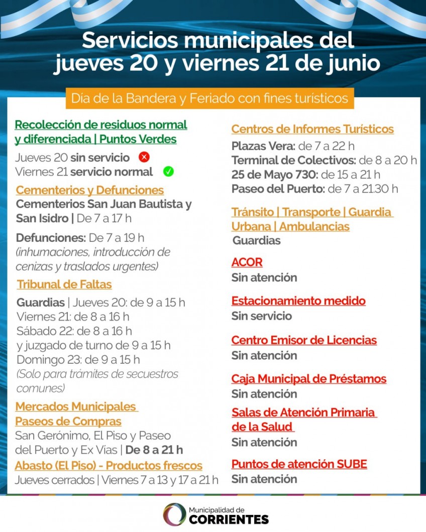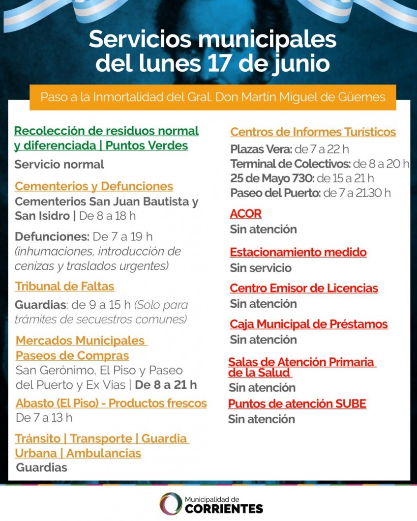 La Municipalidad de Corrientes informa cómo será el funcionamiento de las dependencias y servicios a su cargo en los próximos feriados nacionales del 17, 20 y 21 de junio, y el feriado municipal del lunes 24 del corriente.