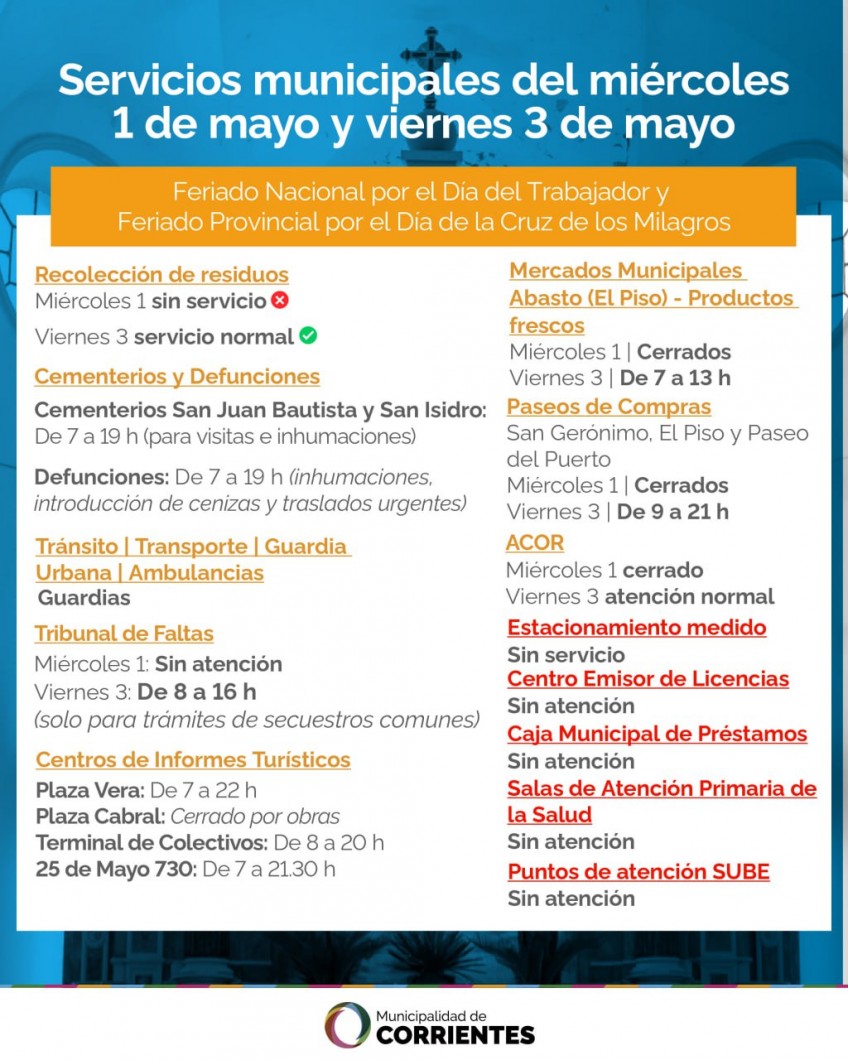 La Municipalidad de Corrientes comunica acerca del funcionamiento de los servicios que brindarán sus distintas dependencias para el miércoles 1 de mayo, feriado nacional por el Día del Trabajador, y el viernes 3 de mayo, feriado provincial por el Día de la Cruz de los Milagros.
