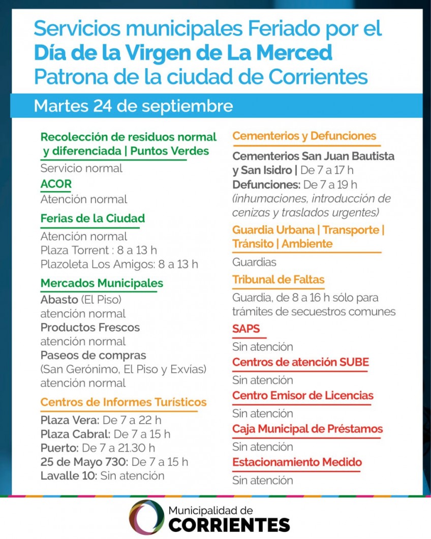 La Municipalidad de Corrientes informa acerca del funcionamiento de los servicios que habitualmente brinda a los vecinos para el próximo martes 24 de septiembre, en razón del feriado provincial que rige para esta ciudad por la conmemoración del Día de la Virgen de la Merced.
