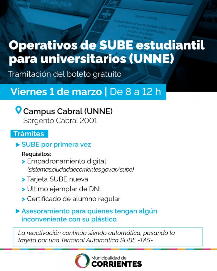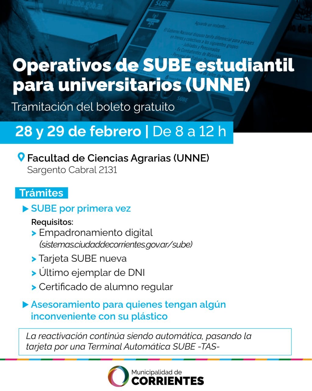 Esta semana, la Municipalidad de Corrientes realizará operativos de SUBE Estudiantil en distintas dependencias universitarias de la UNNE. El 28 y 29 de febrero el asesoramiento será en la Facultad de Ciencias Agrarias -Sargento Cabral 2131-; el 1º de marzo en el campus Cabral -Sargento Cabral 2001- y el 4 y 5 de marzo en la Facultad de Odontología -Av. Libertad 5450-; en los tres lugares, el horario de atención será de 8 a 12.