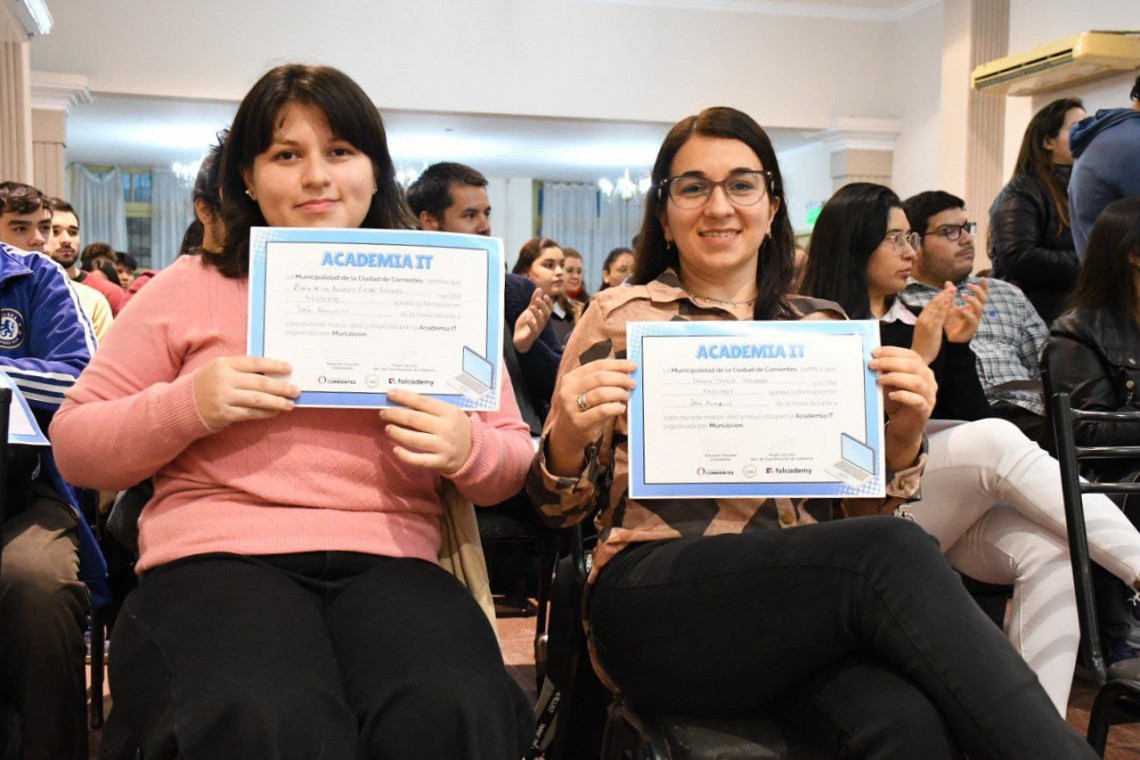 El intendente participó del acto de entrega de 76 certificados de aprobación de los cursos de la Academia IT del programa Muni Joven. La iniciativa municipal está destinada a formar a jóvenes correntinos de 18 a 26 años en tecnología, programación y mundo software.
