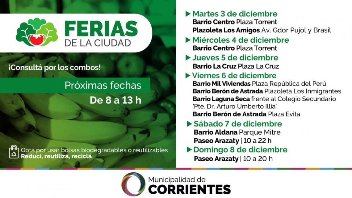 En el inicio del último mes del año, el martes 3 los feriantes estarán en la plaza Torrent -San Lorenzo y Bolívar- y en plaza Los Amigos del barrio Libertad, frente a la escuela Nº6 por calle Brasil.