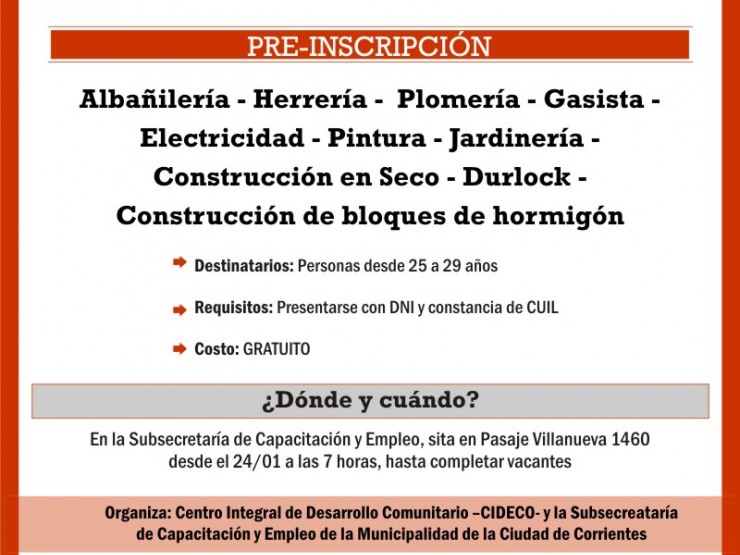 Los interesados podrán acercarse a preinscribirse desde este miércoles 24 de enero en Pasaje Villanueva 1460, con DNI y constancia de CUIL desde las 7.