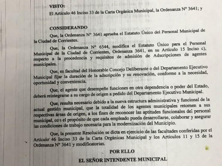 El personal de la Municipalidad de la Ciudad de Corrientes que figura adscripto a otra dependencia deberá inmediatamente presentarse a su lugar de origen.
