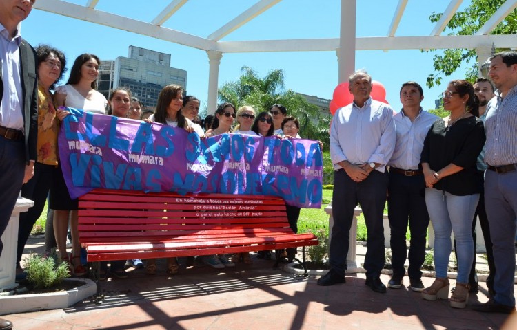 Inauguraron un banco rojo en la plaza Vera para concienciar sobre la violencia de género