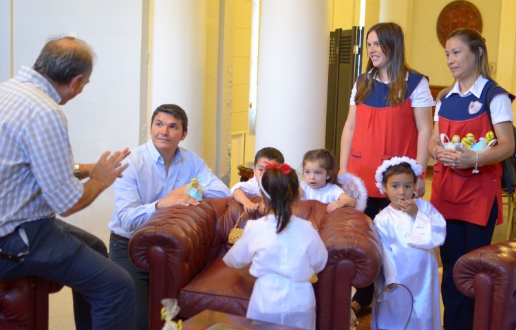 Vestidos de ángeles, los alumnos de la sala de 3 años fueron recibidos por el viceintendente, Emilio Lanari; y el secretario de Coordinación de Gobierno, Hugo Calvano.